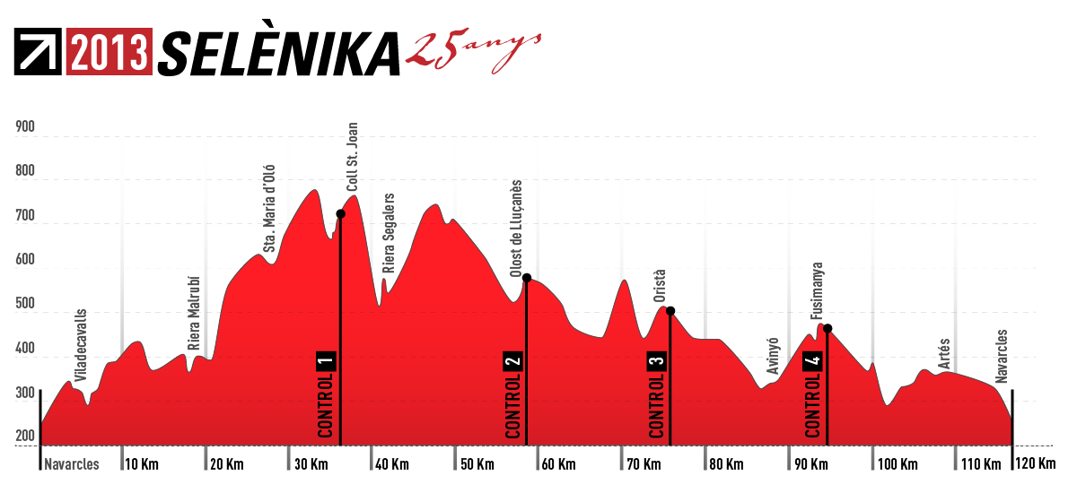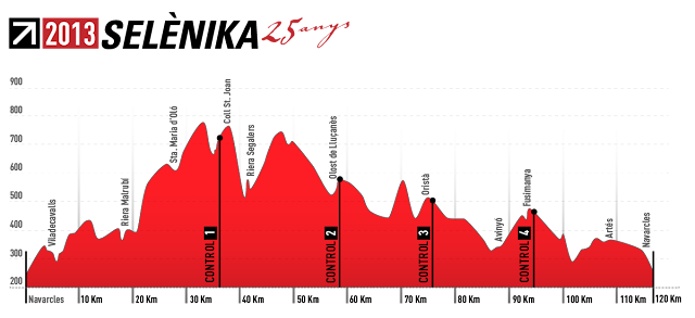 Por fin las 8, y salimos!!! la cosa empieza bien, salimos del pueblo, por pista todo bastante seco, polvo y piedras, un poco apretujado hasta los 20 km primeros por un par de *repetxons fuertes, con sus tapones correspondientes. Tuvimos que bajar de la bici,Pau y Benito tiran como unos posesos yo me mantego en mi linea de pedaleo y guardo fuerzas para luego que seguro las necesitaremos. . La primera parte que a priori era la de mas desnivel, llegamos suficiente be al 1ºer avituallamiento. Intenté coger mi ritmo y adelante, llegamos a una riera que nos hacen cruzar por unas rocas. *OHHH que guapo!!!. Volvemos a subir y llegamos al 2ºcontrol, se había hecho corto!!! !!! Agua, comer, y a continuar, qué calor !!! Recuerdo el grafico de desnivel, y a partir de aquí ya era mas rodadora, pensaba,y de repente me encuentro a Benito empujando la bicicleta, como no pinchazo y para colmo no tenia inflador,le ofrezco el mio y le comento que queda poco para el 3º avituallamiento y que le espero alli. Llego al 3ºer control, ahora si, molestias al quàdriceps y mucho calor, saco el cortavientos que traía, un poco de isotónica, plátanos mas y como veo que Benito no viene decido tirar para adelante. Este tramo fue para mí lo más duro, era uno rompe piernas sube y baja, el sol picaba de lo lindo , el paisaje era muy guapo, nos hicieron pasar por un puente de piedra muy xulo !!! Llegamos al 4º control bastante tocados, ahora si faltaban unos 22km y todo bajada, esto nos decían !! las molestias continuaban e iban a peor pero teníamos que acabar... Sorpresa, mira que era toda pistera!!! pues no !!! los últimos 12km nos hicieron pasar por unos trialeras con un paredes de rampas que parecían escaleras, aquí sufrimos casi todos y ya era al final, madre mía qué final!!! esto si, el paisaje muy guapo, Por fin llegamos a meta yo en 8.20 reto conseguido !!!, alli me esperan los niños y la mujer.